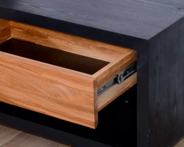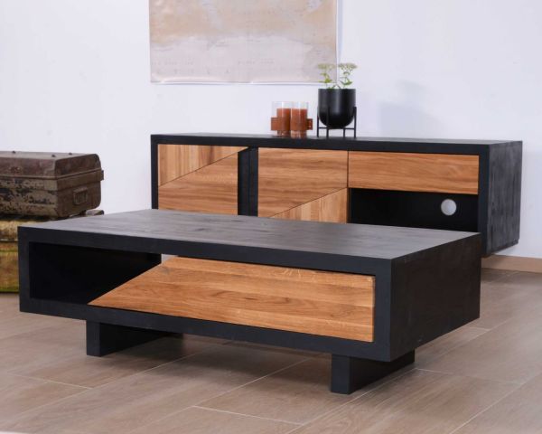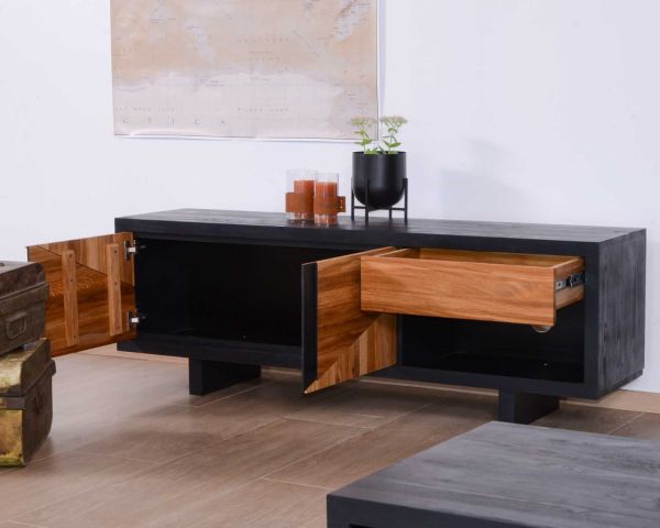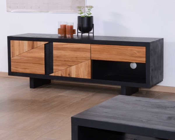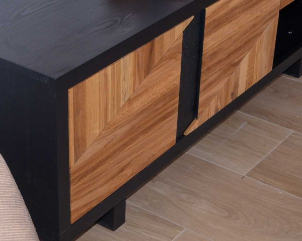 Il grande mobile TV "Flix" in rovere e pino massiccio è un perfetto esempio di design moderno, efficace e accogliente. Il mix di due tipi di legno e di due colori conferisce a questo mobile un design contemporaneo.