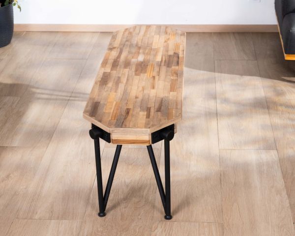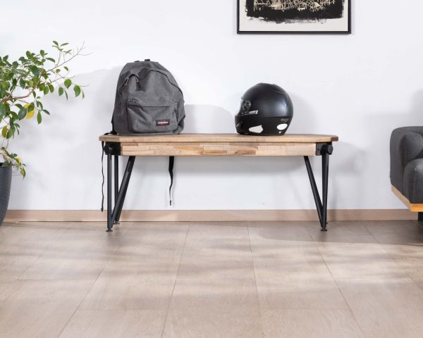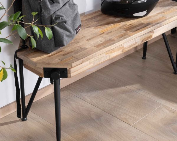 Pratica e dal fascino discreto, la panca "Bendigo" in legno massiccio di recupero e metallo nero è pronta a integrare il vostro ingresso o i lati del vostro tavolo da pranzo.