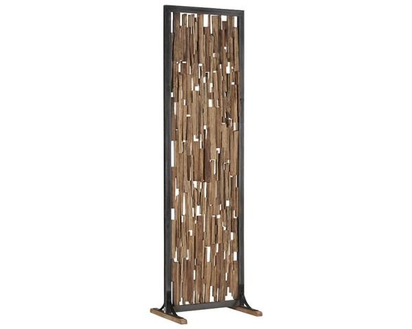 Un magnifico divisorio o paravento realizzato con pezzi di teak abbinati a una base di metallo nero. Semplicemente per decorare, separare uno spazio o creare un po' di privacy in una stanza, sarà la vostra carta vincente in casa.