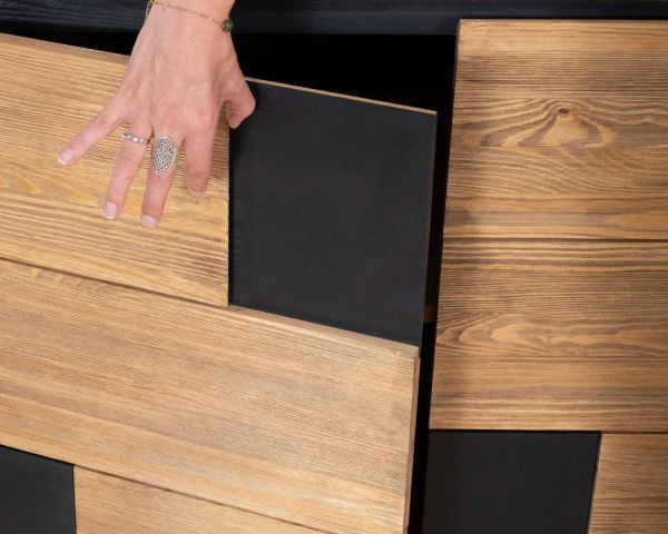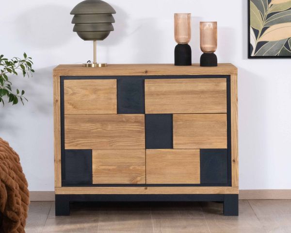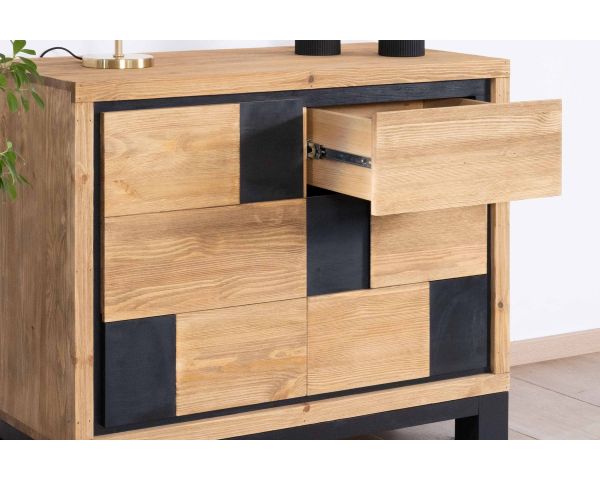 Materiali: Pino massiccio spazzolato, motivo quadrato tinto nero, schienale e fondo cassetto in MDF laccato nero