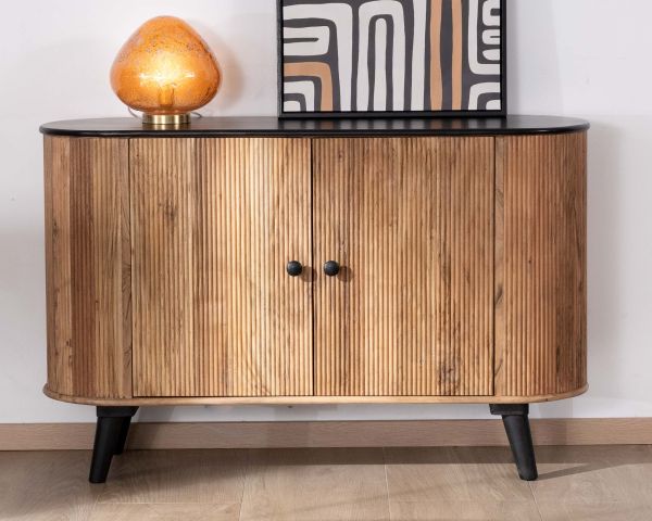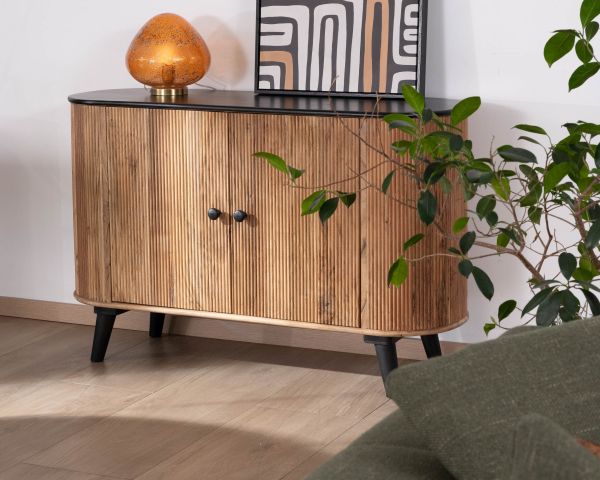 La credenza a 2 ante "Boogie" è il perfetto equilibrio tra retrò e moderno. Realizzato in acacia massiccia con finitura bicolore olio e nero, questo mobile contenitore basso mette in risalto le sfumature naturali del legno, sottolineate dai frontali in rilievo che aggiungono ritmo e consistenza all'insieme.