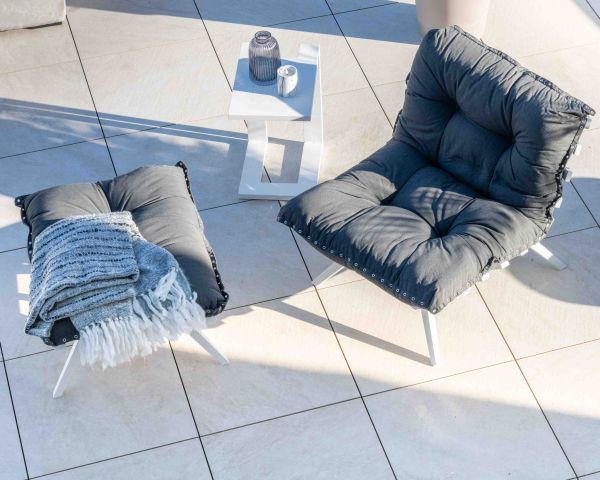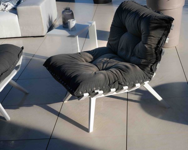 Godetevi un comfort eccezionale in uno stile sofisticato e grafico con la poltrona lounge in tessuto grigio scuro e alluminio bianco della collezione "Lisca" e il suo poggiapiedi modulare.