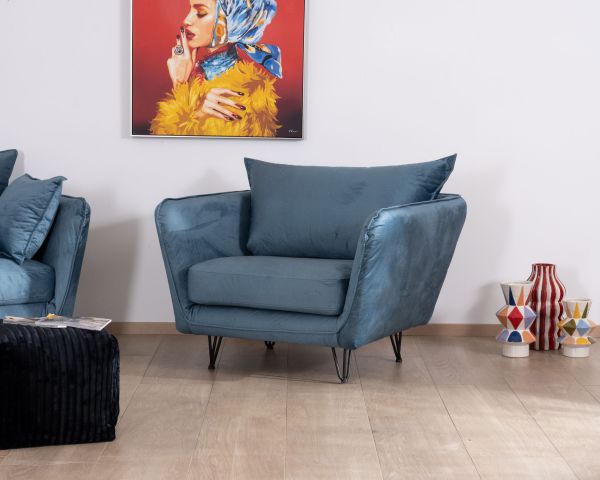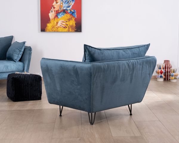 Con le sue dimensioni di 109x95x86 cm (LxPxH), questa eccezionale poltrona blu starà benissimo nel vostro salotto o giardino d'inverno contemporaneo. Si collocherà perfettamente davanti a un bel tappeto beige e sarà accompagnata da un tavolino in metallo e vetro. Potrete godervela mentre prendete un caffè o fate una pausa di lettura, ad esempio. In un salotto arredato in modo sobrio, darà quel tocco di audacia che farà la differenza. Con il suo colore insolito, il design unico e le originali gambe in metallo, ruberà la scena agli altri mobili della casa.