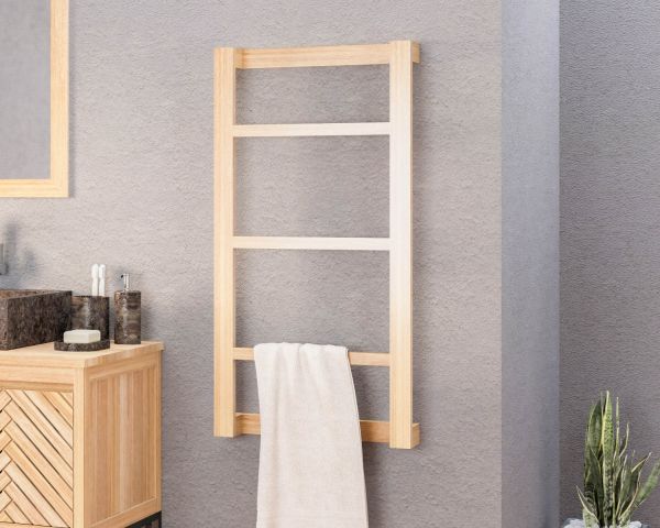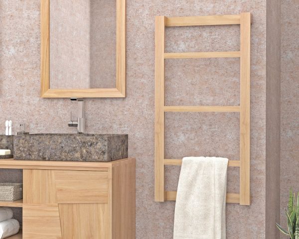 Realizzato in legno massiccio di teak, questo portasciugamani si integra perfettamente con i mobili da bagno in legno della stessa specie per un'atmosfera moderna e zen, ma si abbina perfettamente anche ai mobili in metallo in stile industriale.