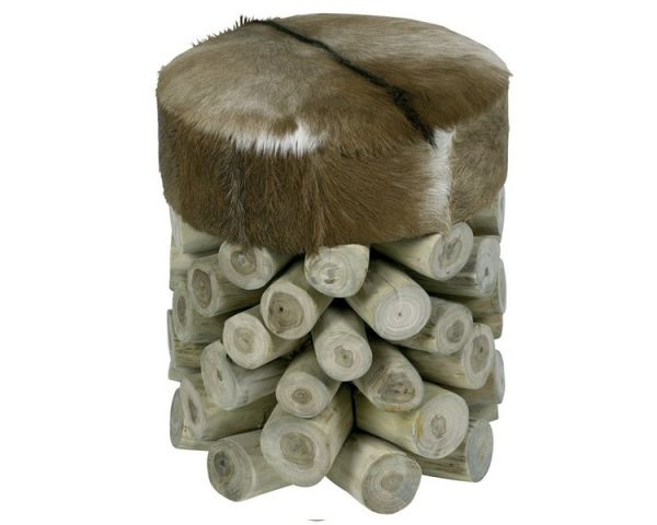 Ci piace molto questo originale sgabello in legno, con la sua seduta in pelliccia naturale marrone e le gambe in teak che sembrano pigne. Questo sgabello può essere collocato in un salotto accanto a un camino a legna, ma può anche essere utilizzato in un giardino d'inverno trasformato o persino in una camera da letto come insolito comodino.