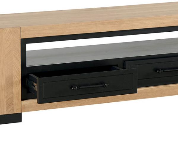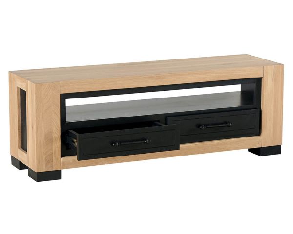 Questo mobile TV ha dimensioni pratiche, con una lunghezza di 140 cm, una profondità di 43 cm e un'altezza ragionevole di 49 cm. Tutto ciò significa che occupa pochissimo spazio sul pavimento. È facile installare il box internet e il lettore Blu-ray. I 2 cassetti sono montati su guide metalliche e si aprono completamente, in modo da poter riporre facilmente riviste e custodie di DVD o CD. Con i loro frontali in MDF laccato nero e le maniglie in metallo, aggiungono un effetto indus' all'intero mobile.