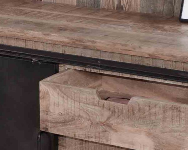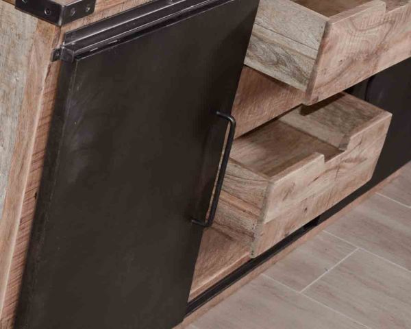 Dettagli tecnici: Mobili consegnati assemblati Legno massiccio di mango e metallo Produzione in piccola serie Dimensioni interne: nicchia superiore: H40xW58xD35 / nicchia inferiore: H32xW58xD35 / cassetti: H11xW48xD34 84 kg
