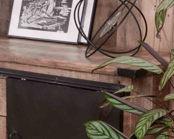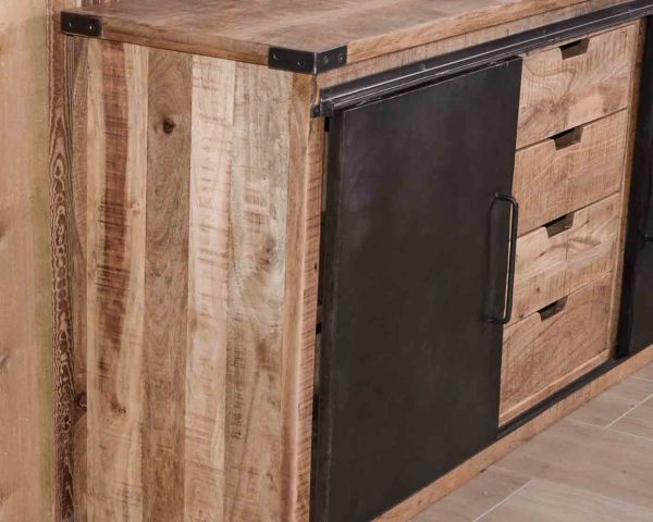Credenza in legno massiccio con ante scorrevoli in metallo.