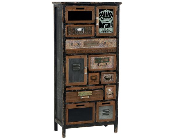 Siete alla ricerca di un mobile che coniughi contenimento e decorazione? Allora questo fa per voi! Scoprite questo armadio alto 134 cm con 10 cassetti portaoggetti. Con una larghezza di 63 cm e una profondità di 32 cm, si inserisce con discrezione nei vostri interni, risultando pratico e originale. L'armadio è realizzato essenzialmente con materiali come l'abete massiccio e il metallo. Anche i cassetti sono realizzati in abete massiccio e metallo, oltre che in zinco e vetro, il che suggerisce una certa robustezza del prodotto.