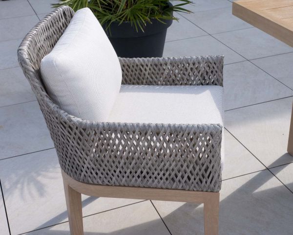 La struttura in teak, rivestita in textilene imitazione rattan grigio finemente intrecciato, offre una seduta avvolgente e accogliente. Sottilmente etnica, questa sedia aggiungerà un tocco esotico a una terrazza contemporanea, per godersi un pasto al sole.
