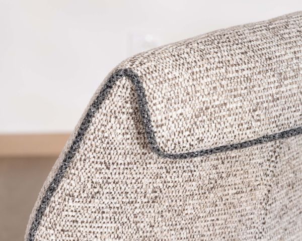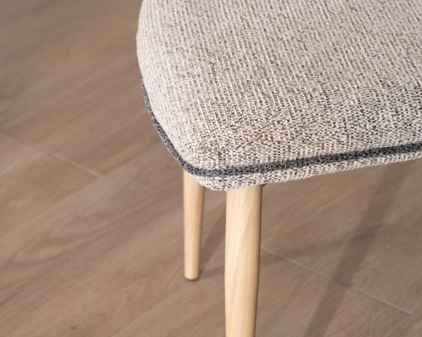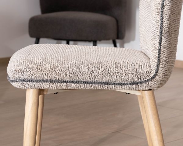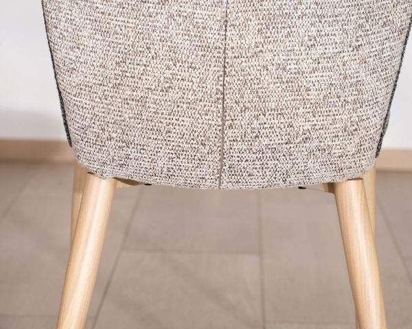 Le gambe in legno color rovere chiaro aggiungono un tocco di autenticità e assicurano una perfetta stabilità a questa sedia ultra-chic e accogliente. La texture del tessuto e le sfumature dei colori dei fili creano una sedia dal fascino caldo e neutro, ideale per interni eleganti, sia contemporanei che scandinavi o più classici.