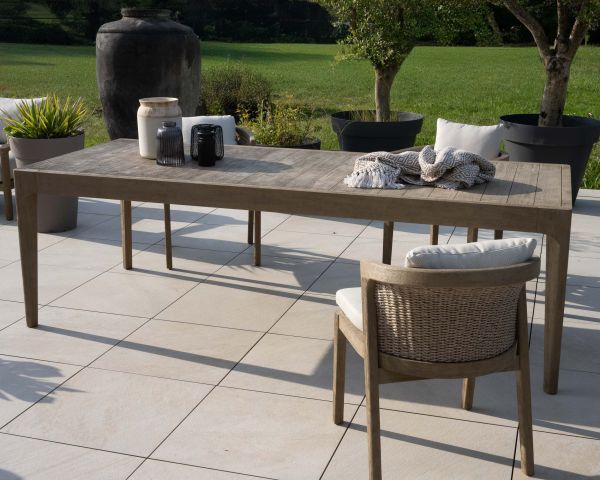 Il legno di teak è naturalmente resistente all'acqua e alla putrefazione. Nel corso delle stagioni e con l'esposizione al sole e alle intemperie, il teak può assumere tonalità grigie. Per preservare la lucentezza originale del teak e proteggerlo da eventuali tracce d'acqua, è possibile oliarlo occasionalmente, una o due volte l'anno a seconda dell'uso e dell'esposizione.