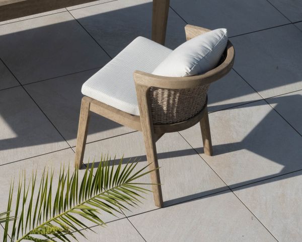 Il cuscino in tessuto screziato ecrù, appositamente progettato per l'uso esterno, garantisce un comfort ottimale pur rimanendo resistente alle condizioni esterne. La seduta generosa e l'ergonomia ben studiata consentono di godere appieno dei pasti all'aria aperta, aggiungendo un tocco sofisticato all'arredamento del giardino.
