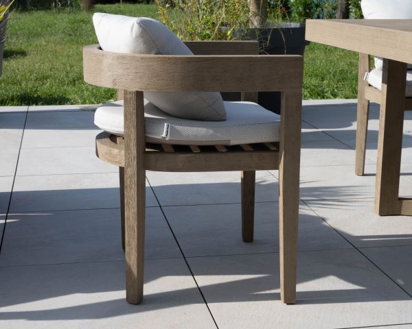 Il legno di teak è naturalmente resistente al marciume e durevole. L'esposizione prolungata al sole e alle intemperie può conferire al legno una sfumatura grigiastra, che però non ne compromette la resistenza. Per preservarne la lucentezza a lungo termine, si consiglia di nutrire il legno con un prodotto adatto una o due volte l'anno, a seconda dell'uso, ad esempio in autunno e in primavera. Si consiglia inoltre di limitare l'esposizione continua ai raggi UV e di riporre i mobili al coperto quando non vengono utilizzati per lunghi periodi.