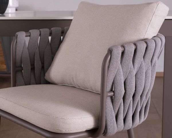 Materiali: alluminio grigio champagne, trama in textilene grigio, tessuto speciale per esterni screziato ecrù, imbottitura in schiuma QuickDry