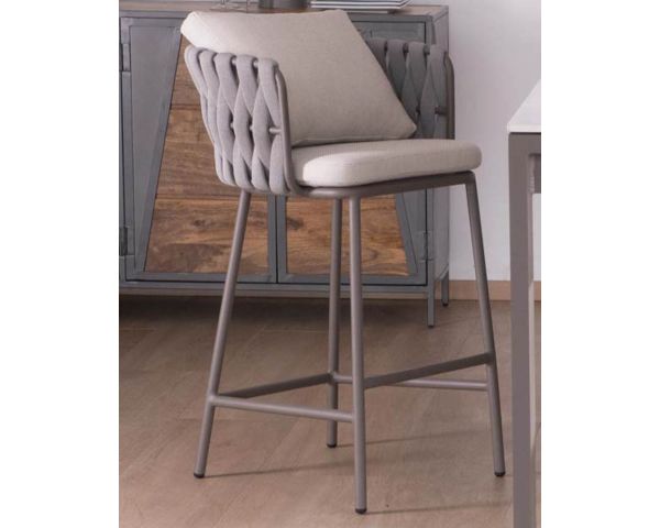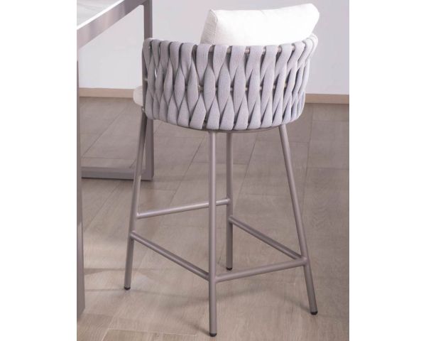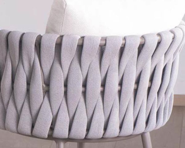 Combinando eleganza innata e fascino disinvolto, il seggiolone "Chinon" in alluminio e tessuto aggiunge un tocco di raffinatezza contemporanea alla vostra isola da pranzo. Il suo design inconfondibilmente chic è evidente nello schienale avvolgente, realizzato in corda di textilene grigio accuratamente intrecciata su una struttura in alluminio grigio champagne.