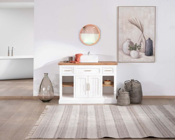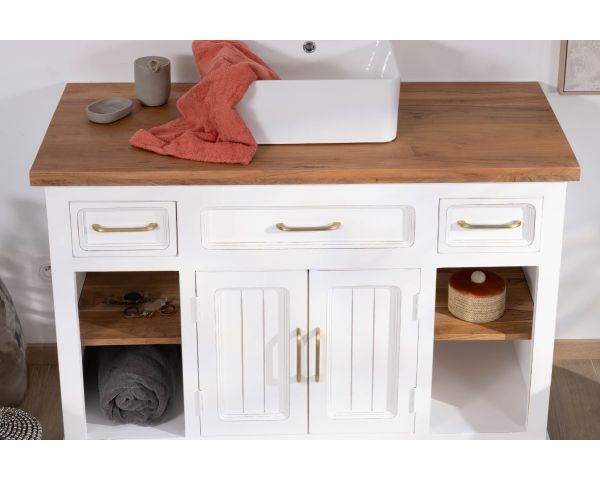 Con una larghezza di 120 cm, questo semplice mobile da bagno in acacia occupa poco spazio grazie alle nicchie laterali ed è pratico grazie alle varie possibilità di contenimento.