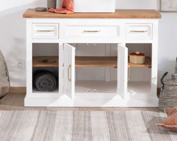 Realizzato in acacia massiccia, questo mobile da bagno è una garanzia di solidità e durata. Combinando il legno naturale con la vernice bianca, questo mobiletto offre un contrasto morbido, delicatamente esaltato dalle maniglie in metallo dorato. Il colore bianco è simbolo di chiarezza, purezza e freschezza, tutte nozioni che trovano posto nel vostro luogo di ringiovanimento.