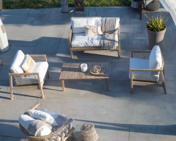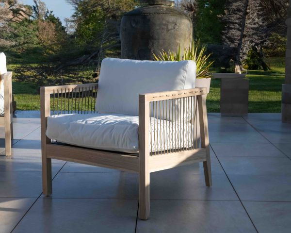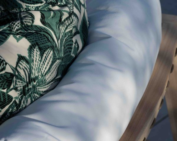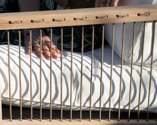 Materiali: Teak massiccio, corda, tessuto, imbottitura in schiuma, textilene