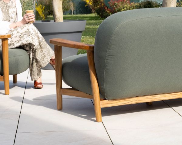 Materiali: Tessuto speciale per esterni, imbottitura in schiuma, teak massiccio
