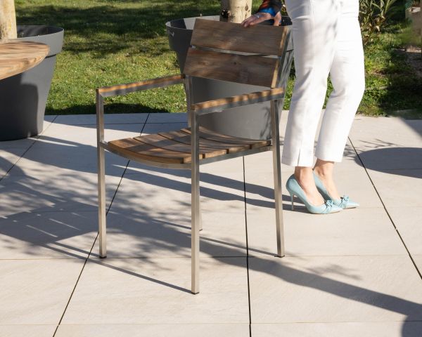 Il teak, noto per la sua resistenza come il rovere, è estremamente durevole, resistente e imputrescibile, grazie al suo contenuto di olio naturale. Inoltre, in fase di progettazione viene trattato appositamente per l'uso esterno. Tuttavia, con il passare delle stagioni e l'esposizione al sole e alle intemperie, il teak può assumere tonalità grigie.