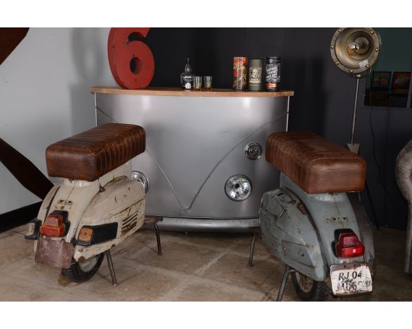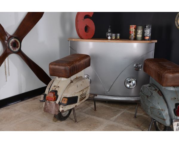 La Vespa è senza dubbio il più leggendario degli scooter, progettato da Piago nel 1946. Questo sgabello è basato sulla parte posteriore di una Vespa della metà degli anni Cinquanta. Ha una griglia metallica con effetto ruggine e un sedile lungo e largo in pelle invecchiata. La seduta è piuttosto alta e imbottita, con cuciture a sella per una maggiore eleganza. Le ali sono affusolate e dotate di condotti di ventilazione. Il sedile è dotato di poggiapiedi per un maggiore comfort e di quattro piedi per la massima stabilità. Con un'altezza di 89 cm e una forma arrotondata, questo mobile altamente ergonomico si colloca perfettamente accanto al bar.