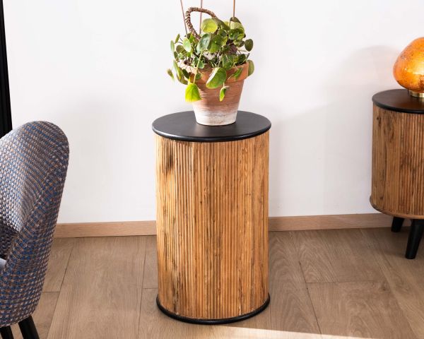 La base cilindrica, scolpita con scanalature verticali, gioca con i volumi e le texture, aggiungendo un vero e proprio ritmo visivo all'ambiente. Il contrasto bicolore tra la tonalità chiara dell'acacia e i dettagli neri sottolinea l'estetica grafica della collezione Boogie, rafforzandone la forte identità.