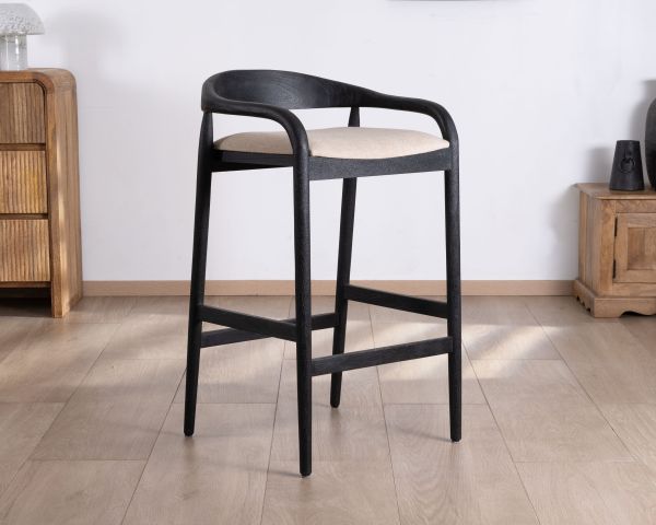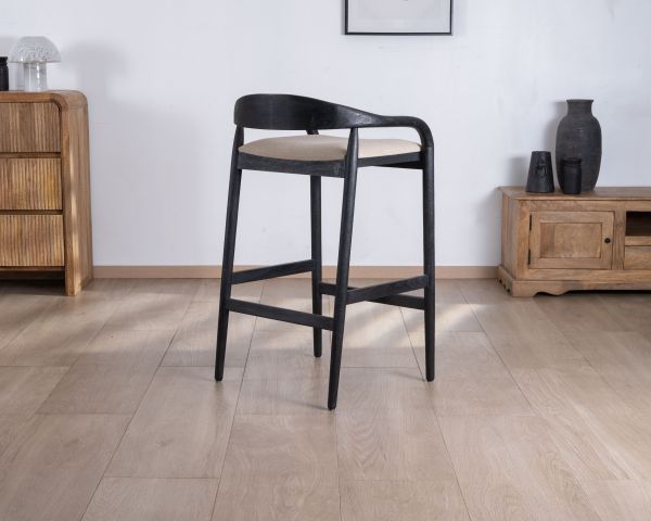 Lo sgabello da bar "Vogue" ha un aspetto contemporaneo ed è comodo da sedersi. Lacombinazione di legno massiccio verniciato di nero e di una seduta in tessuto leggero crea un sottile equilibrio tra design grafico e seduta confortevole per i momenti di relax intorno a un tavolo alto o a un bar.