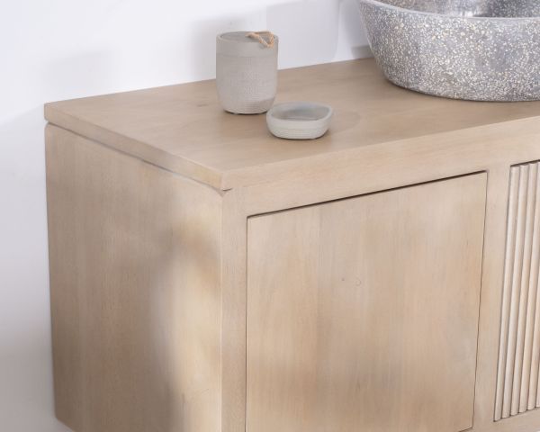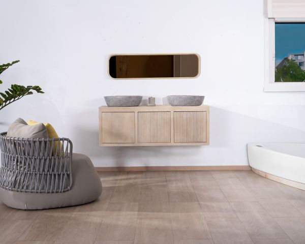 Il legno è trattato in fabbrica per resistere all'uso in ambienti umidi. Si consiglia di pulire quotidianamente gli schizzi d'acqua con un panno morbido o un panno in microfibra per evitare che penetrino nel legno e lo macchino. Per la pulizia quotidiana, è sufficiente una spazzola a setole morbide o una spugna non abrasiva e acqua saponata per la manutenzione dei mobili.