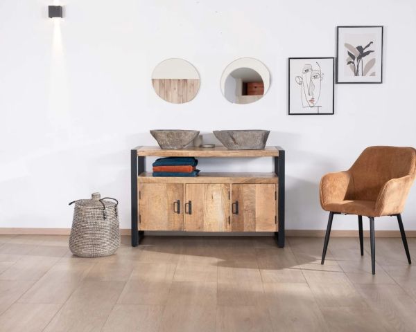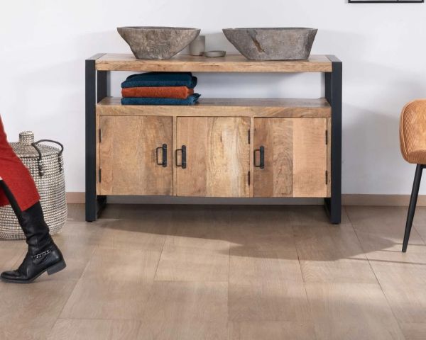 Con il suo stile industriale, questo mobiletto da 125 cm può essere dotato di tutti i lavabi che volete, occupando pochissimo spazio. Grazie all'ampia nicchia e ai tre armadietti, questo mobile in legno di mango e metallo consente di tenere in ordine gli articoli da toeletta e gli accessori.