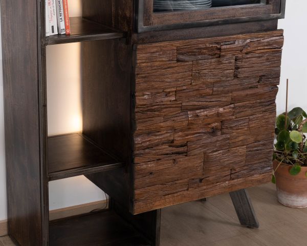 Materiali: Legno massiccio di acacia, legno di recupero, metallo, vetro, legno compensato