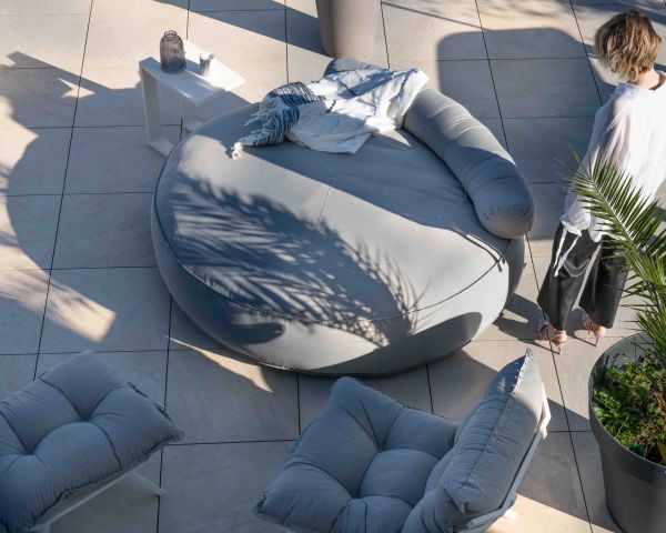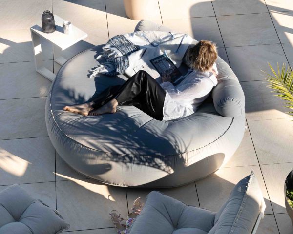 Con un diametro di 1m80, questo mobile da esterno si presenta come un voluminoso cuscino sul quale sognerete di rilassarvi da soli o in coppia sulla sua superficie accogliente e generosa.