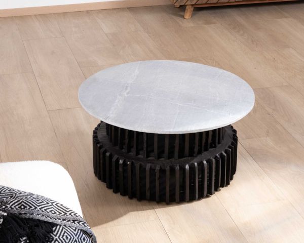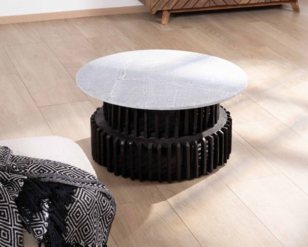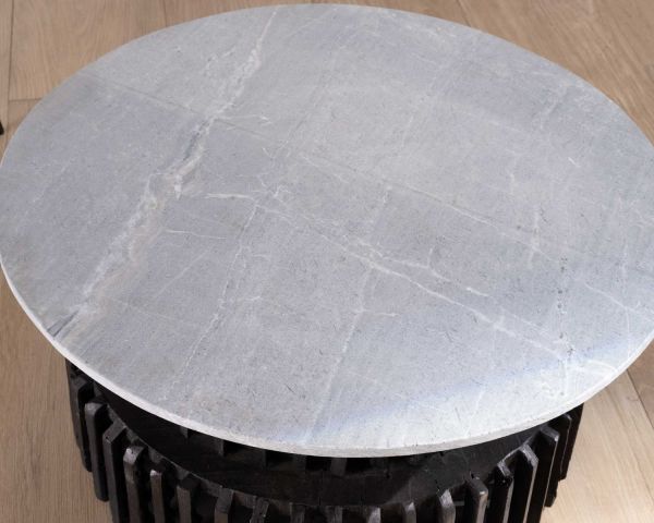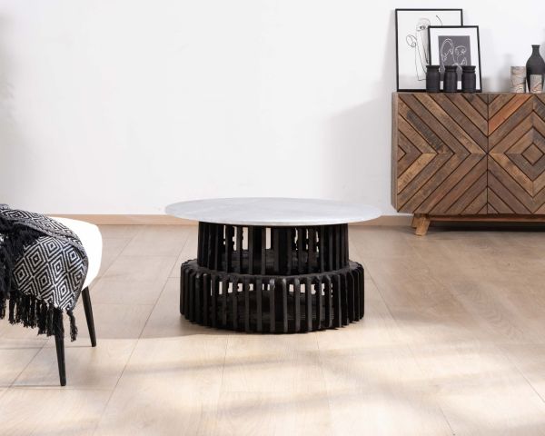 Il tavolino rotondo da 80 cm con piano in pietra della collezione "Nepalaise" ha un carattere singolare e inclassificabile.