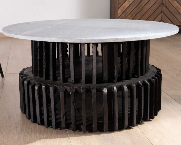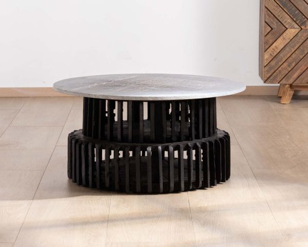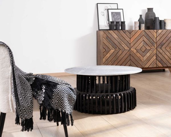 I colori monocromatici di questo tavolino in legno di recupero e pietra naturale si sposano perfettamente con un'ampia varietà di stili decorativi. In un ambiente etnico o riciclato, questo sobrio tavolino sarà esaltato dai colori caldi e dai materiali organici, aggiungendo un ulteriore tocco di carattere allo spazio.