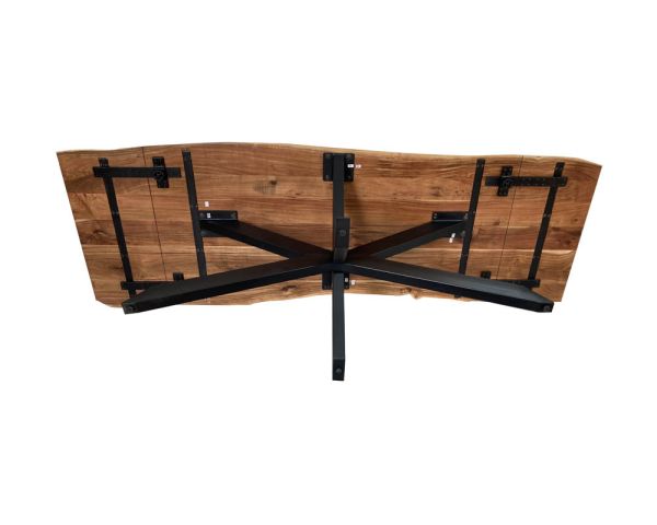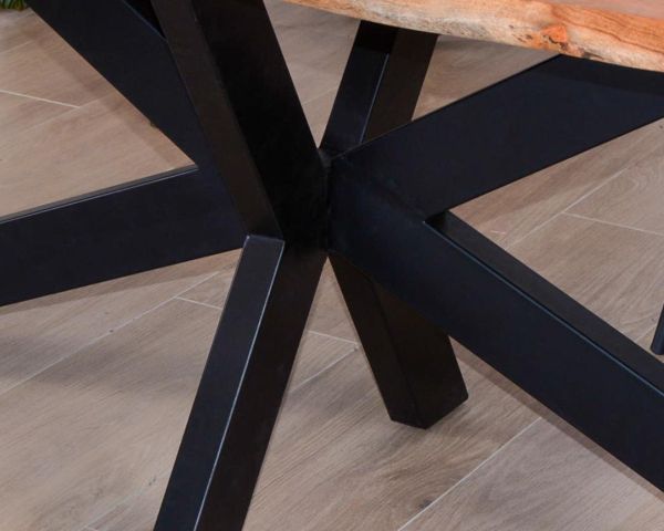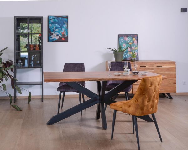 Le gambe Mikado in metallo nero garantiscono solidità e stabilità. Aggiungono un tocco di modernità all'insieme. I bordi naturalmente ondulati del piano e i suoi colori caldi si fondono perfettamente con l'aspetto duro del metallo. Questo tavolo diventerà un elemento di spicco dei vostri interni.