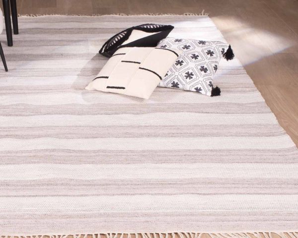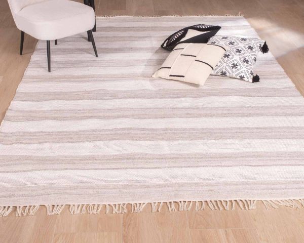 Questo tappeto a righe della collezione "Chart" vi conquisterà con il suo design senza tempo e le sue righe nei toni del beige e del bianco, la cui sobrietà è tanto confortante quanto elegante.