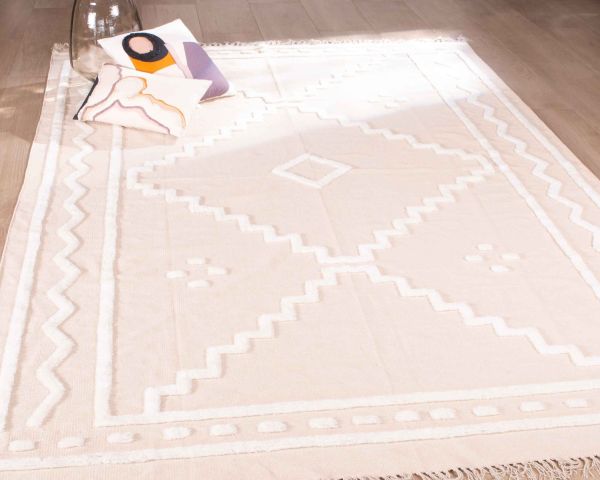Tessuto a mano, questo tappeto dai colori tenui e neutri donerà calore ed eleganza alla vostra stanza e contribuirà a creare un'atmosfera rilassante. Con una dimensione di 120x180 cm, può essere collocato in una stanza di dimensioni modeste, come una camera da letto, aggiungendo un tocco di fantasia delicato e sofisticato grazie ai suoi motivi grafici.