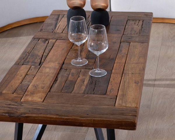 Il piano presenta un motivo patchwork realizzato con pezzi di legno riciclato che lascia che ogni elemento porti le proprie striature, asperità e crepe per dare a questo tavolino la sua personalità unica. Gli spazi vuoti lasciati tra un'asse e l'altra esprimono chiaramente il desiderio degli artigiani di evidenziare la natura grezza dei materiali utilizzati, aggiungendo ricchezza visiva al mobile e incarnando perfettamente lo spirito dello stile di recupero.