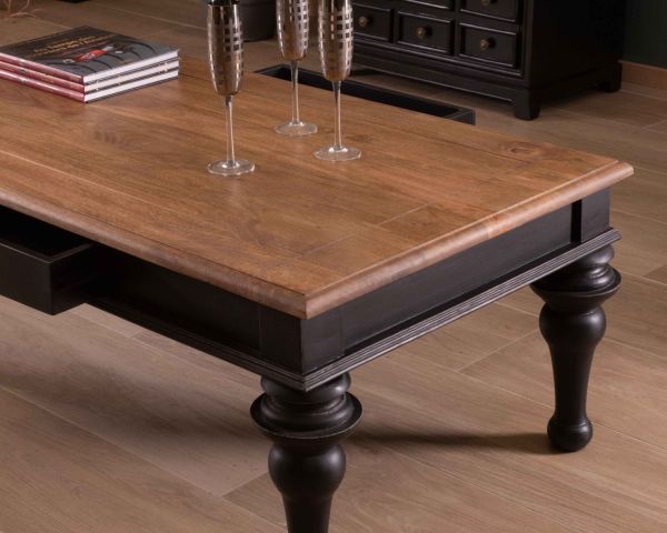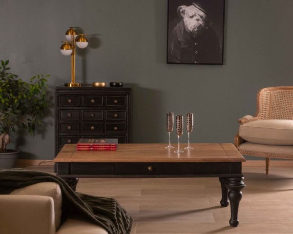 Lasciatevi sedurre dal tavolino rettangolare "Legacy". Con il suo mix di arredamento country e stile barocco, non potrà che piacere. La patina nera contrasta splendidamente con il piano naturale per un effetto sorprendente. Questo mix di colori aggiungerà un tocco di tendenza al vostro salotto. Il pratico cassetto può essere utilizzato per riporre i telecomandi e nascondere qualche dolcetto da gustare davanti al vostro film preferito quando i bambini sono andati a letto... Questo tavolo di buone dimensioni si adatta a spazi piuttosto ampi. Non abbiate paura di immaginare quanto spazio occuperà sul pavimento, così potrete vedere come saranno i vostri mobili prima di acquistarli.