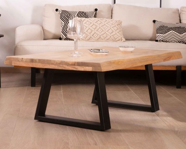 Tavolino di design "Caractère" con piano naturale e gambe in metallo a forma di trapezio