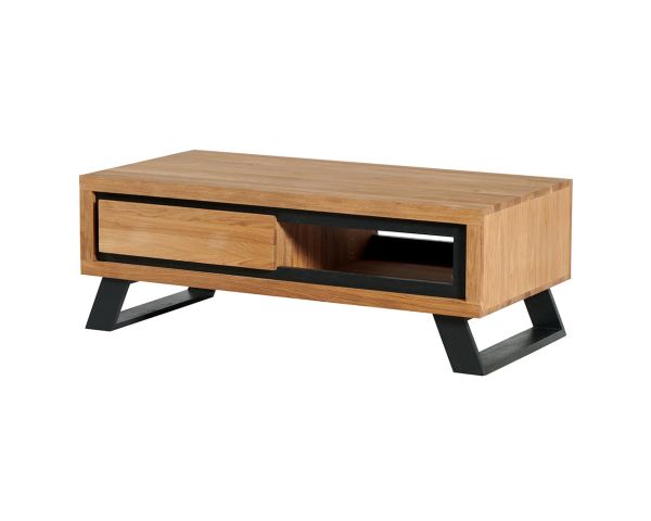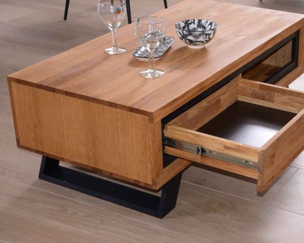 Questo bellissimo tavolo in legno misura 120 x 60 cm ed è alto 38 cm. È stato realizzato in rovere massiccio oliato e MDF laccato nero per un contrasto assoluto. Come il resto di questa gamma armoniosa, le sue linee sono semplici ma ben realizzate. Il cassetto ad apertura totale, montato su guide metalliche, e la nicchia aperta con sporgenze vi piaceranno. Intelligente, non è vero? Potrete riporre i vostri telecomandi, il vostro materiale di lettura attuale e qualsiasi altra cosa abbiate in giro. Volete condividere un pasto in movimento o un piccolo aperitivo? Allora approfittate dell'ampio vassoio per i bicchieri, i piccoli contenitori, ecc.