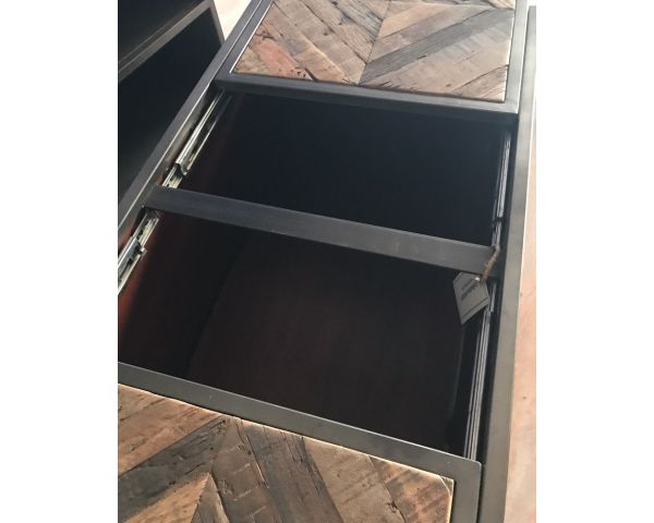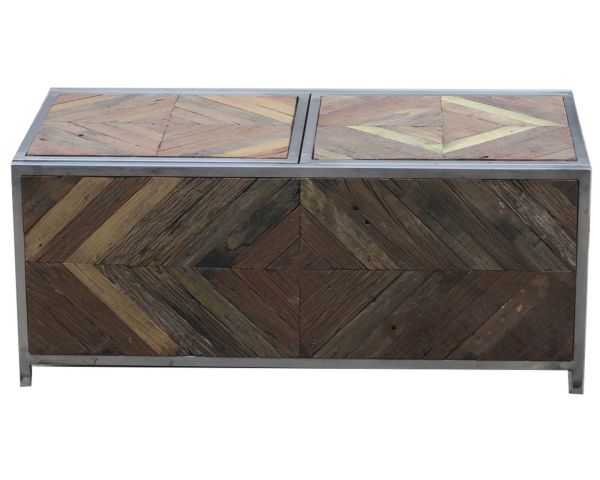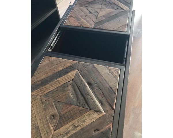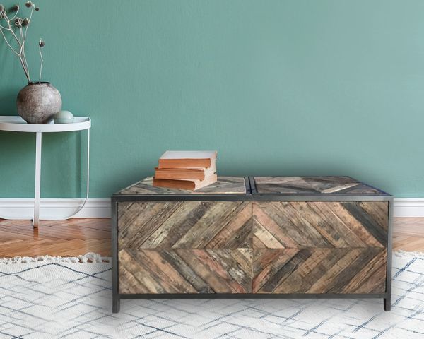 Con le sue dimensioni compatte di 100 x 50 x 45 cm, questo tavolino "Wood" si adatta anche ai salotti più piccoli. La sua struttura in metallo lo rende stabile e molto robusto. La sua decorazione, composta da doghe multiple di legno riciclato che formano dei rombi, lo rende unico e gli conferisce molto carattere.