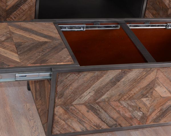 Gli amanti dell'arredamento industriale ameranno questo tavolo in metallo e legno dai motivi geometrici. Con la sua pratica funzione di bar, è possibile riporre al suo interno, lontano dagli sguardi, le bottiglie per gli aperitivi improvvisati.