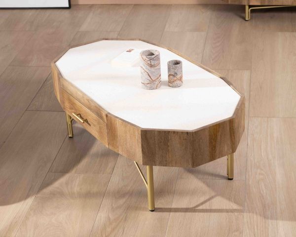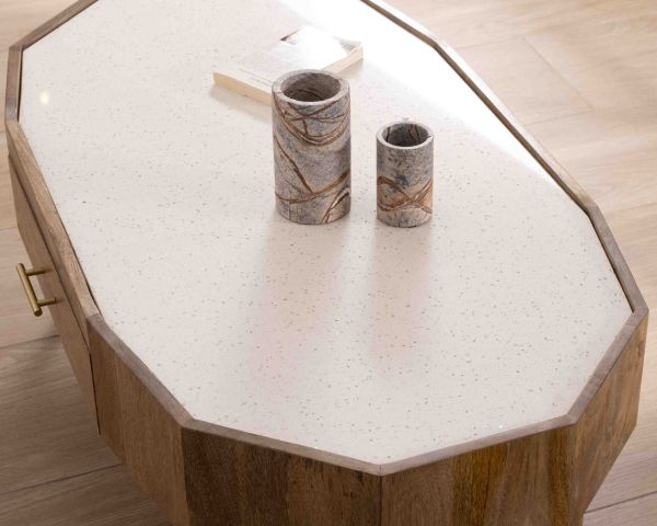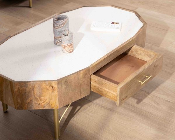 Il suo design insolito, con i bordi ottagonali e la base in metallo dorato, è esaltato dal piano in terrazzo maculato bianco, che aggiunge un tocco di freschezza e allegria all'insieme.