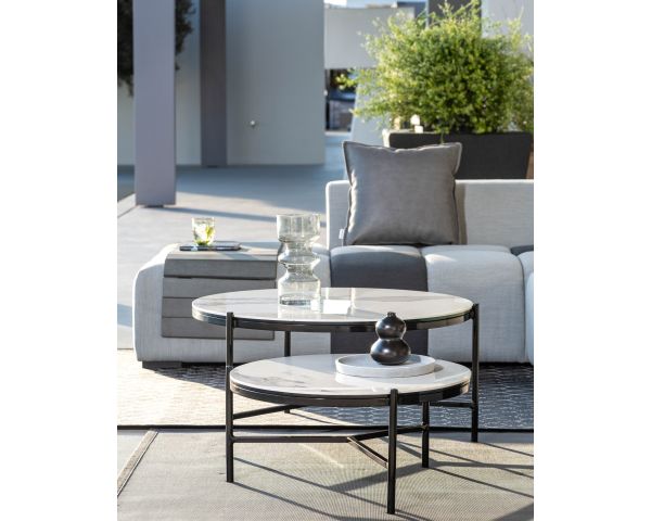 Davanti ai vostri mobili da giardino o contro la vostra sedia a sdraio, il tavolino rotondo (diam. 80 cm - altezza: 40 cm) vi permetterà di appoggiare la vostra rivista e il vostro smartphone. Con le sue tre gambe nere e il piano in ceramica bianca effetto marmo, è un complemento di stile. Semplice ed elegante, il tavolo da esterno "Lazy Beach" è al tempo stesso raffinato e utile. Da solo o affiancato al modello più piccolo (diam. 60 cm - altezza 30 cm), questo tavolino è ideale per il giardino: è leggero e resistente alle intemperie. La struttura in alluminio è un materiale di qualità superiore al metallo e ha il vantaggio di non ossidarsi. Per questo motivo è possibile lasciarlo all'aperto in estate, anche in caso di tempesta o pioggia. Vi consigliamo comunque di svernarlo e di metterlo in autunno nel vostro giardino d'inverno per metterci una bella pianta o i vostri libri..
