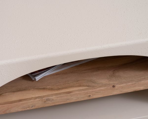 Struttura in MDF dalle linee morbide e pulite, con finitura in cemento sabbiato ed effetto pietra strutturata al tatto