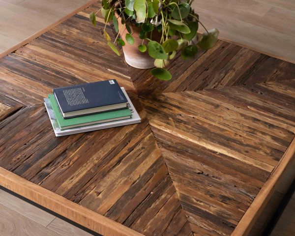 Il piano del tavolo misura 110 cm per lato e crea un tableau ipnotico con il suo motivo geometrico realizzato con pezzi di acacia di recupero. Ogni pezzo di questo legno è lavorato a mano e porta con sé un pezzo di storia, dando a ogni tavolino uno spirito unico in cui le tracce del passato e le piccole imperfezioni hanno il loro giusto posto. L'acacia massiccia è rinomata per la sua robustezza e per le sue calde e varie tonalità di oro, miele e marrone intenso. Queste tonalità, unite alla finitura grezza e strutturata del legno, creano un quadro visivo vivace che questo tavolo mostra con orgoglio.