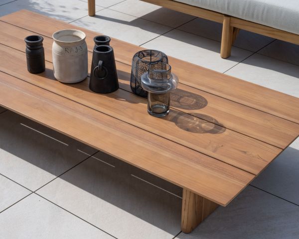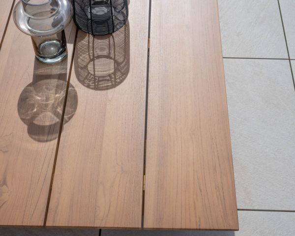 Il legno di teak è naturalmente imputrescibile e resistente all'uso esterno. L'esposizione ai raggi UV e alle intemperie può conferire al legno una sfumatura grigiastra nel tempo, ma ciò non influisce sulle sue proprietà. Per preservare la lucentezza iniziale, si consiglia di limitare l'esposizione continua e di nutrire il legno una o due volte l'anno con un prodotto adatto. Durante l'inverno, è possibile riporre i mobili al coperto per limitarne l'esposizione e conservarli ancora più a lungo.