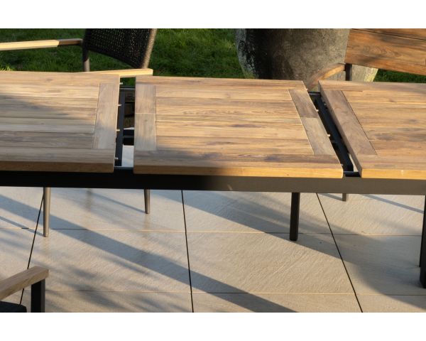 Piano e prolunga in teak riciclato; superficie piana con texture al tatto