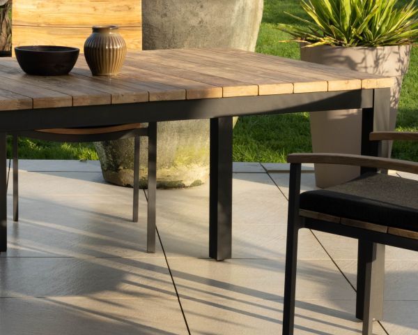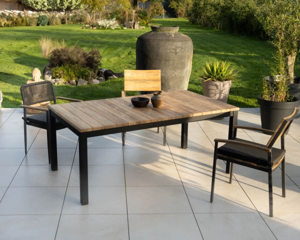 Tuttavia, l'alluminio può essere sensibile ai graffi. Il legno di teak rimarrà bello come il giorno in cui è stato prodotto se viene trattato regolarmente con un prodotto adatto a questa specie naturalmente resistente e imputrescibile.